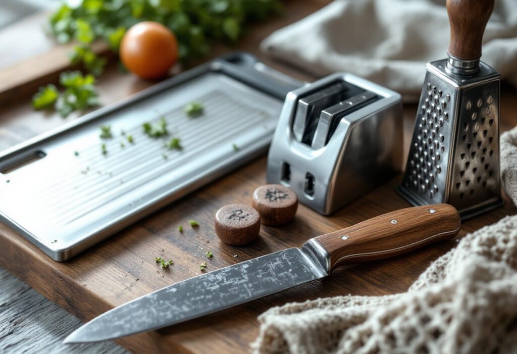 Au-delà de la mandoline, de la râpe et de l’aiguiseur, d’autres ustensiles méritent leur place dans votre cuisine pour améliorer votre expérience culinaire. Une planche à découper de qualité, essentielle pour protéger à la fois votre comptoir et vos lames, renforce vos équipements de base.